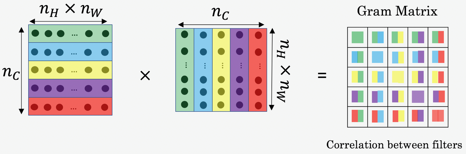 The result is a matrix of dimension $(n_C,n_C)$ where $n_C$ is the number of filters (channels). The value $G_{(gram)i,j}$ measures how similar the activations of filter $i$ are to the activations of filter $j$.